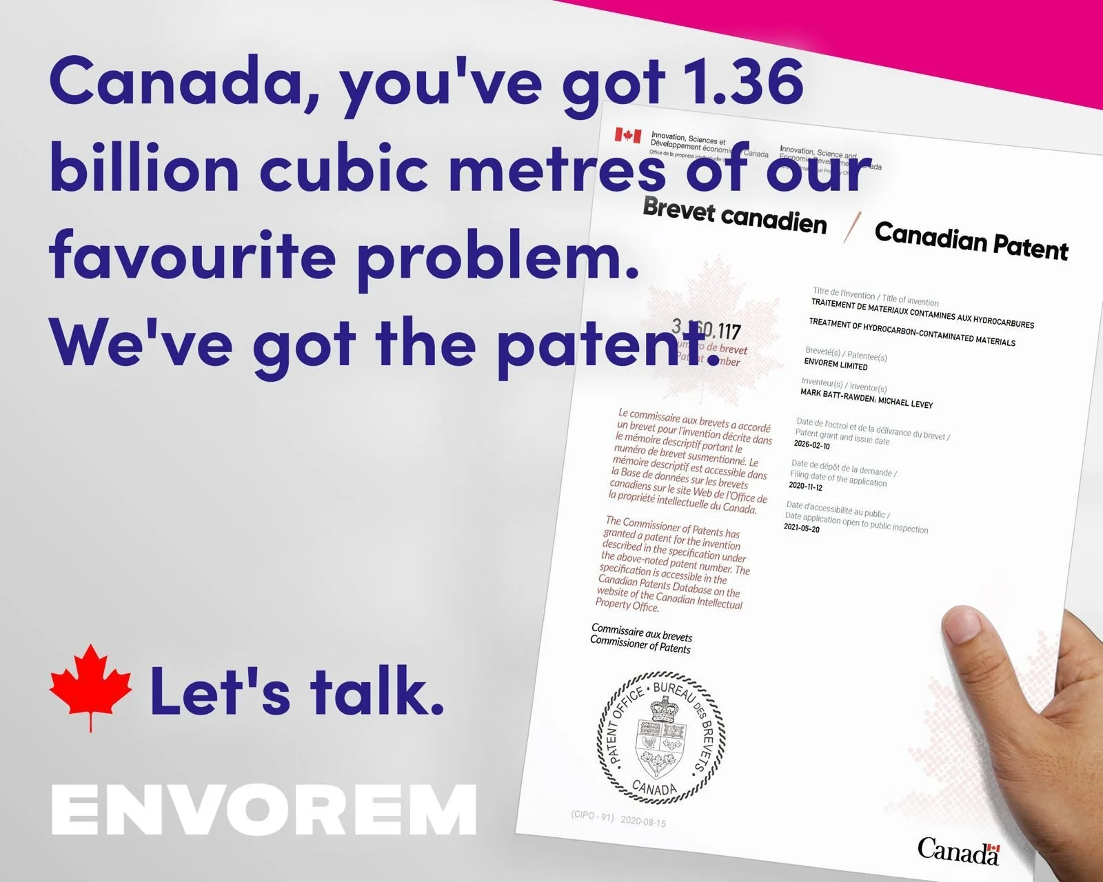 Canada is a strategically important market for hydrocarbon-contaminated waste treatment. As Envorem looks ahead, the Canadian patent doesn’t just recognize the innovation, it also creates a stronger platform for future technical and commercial engagement in the region.